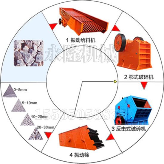 大塊石料經(jīng)料倉由振動給料機(jī)均勻地送進(jìn)鄂式破碎機(jī)進(jìn)行粗碎,粗碎后的石料由膠帶輸送機(jī)送到反擊式破碎機(jī)進(jìn)行進(jìn)一步破碎;細(xì)碎后的石料由膠帶輸送機(jī)送進(jìn)振動篩進(jìn)行篩分,篩分出幾種不同規(guī)格的石子,滿足粒度要求的石子由成品膠帶輸送機(jī)送往成品料堆;